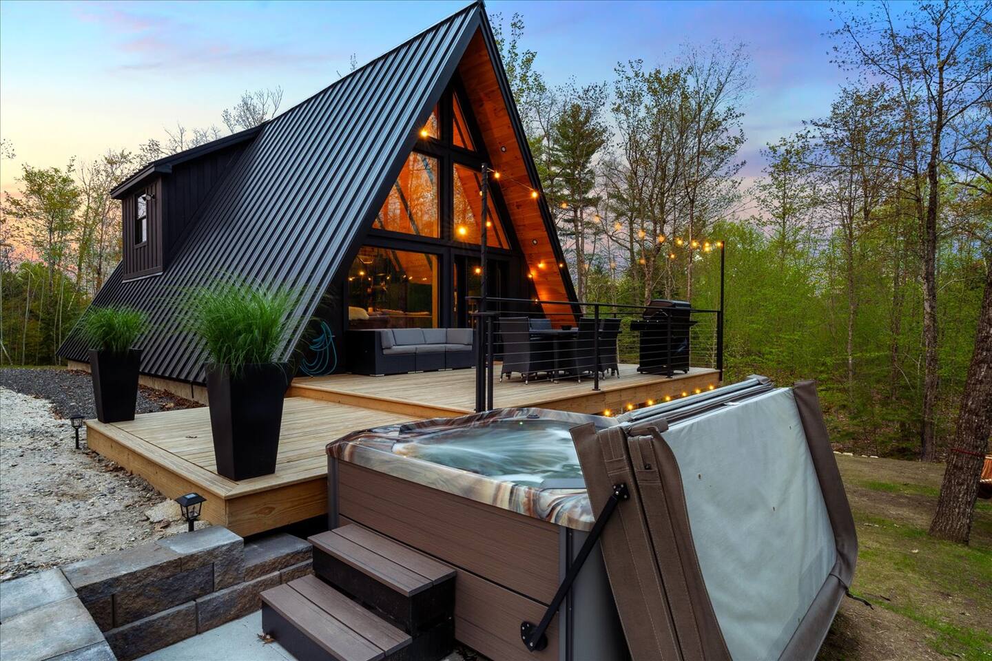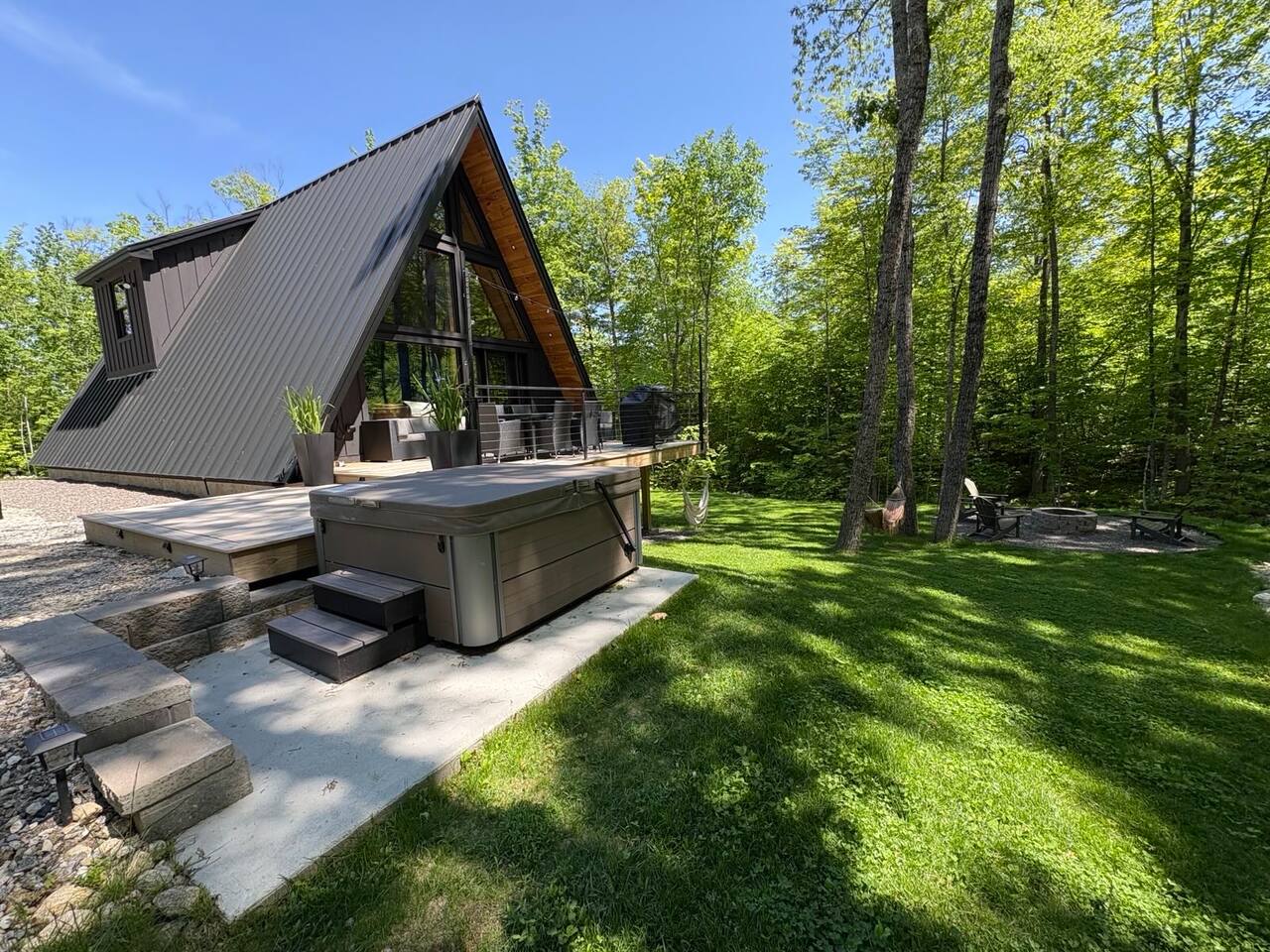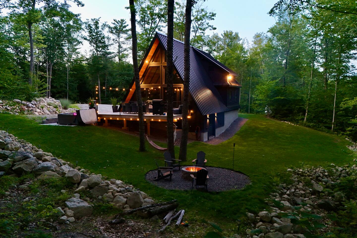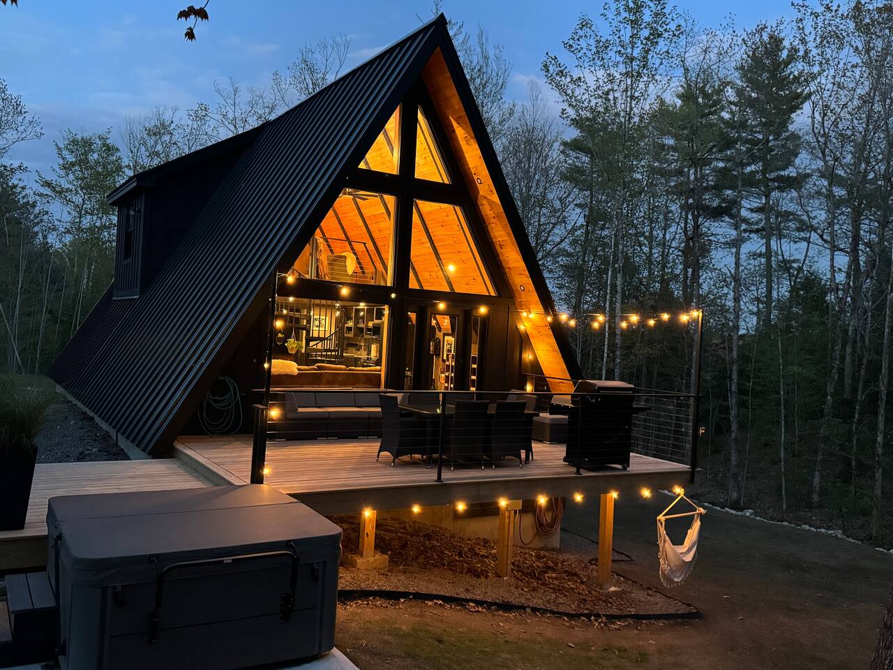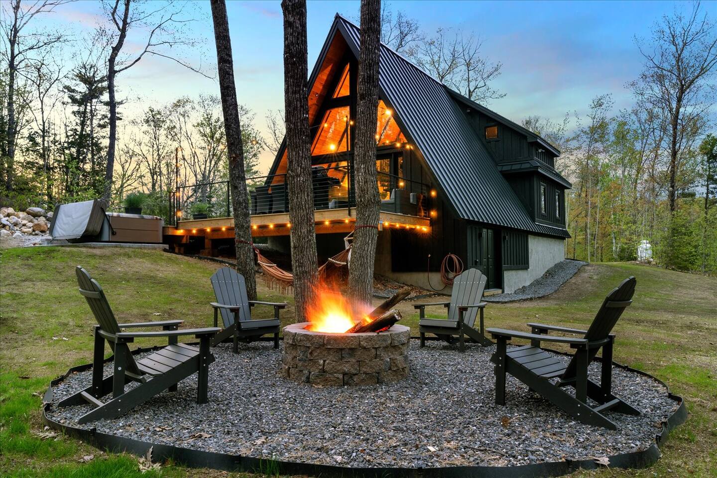 Luxury and privacy await in this stunning A-frame retreat. Minutes from Sebago Lake State Park and Nasons Beach. Relax in the 3-4 person hot tub or gather around the fire pit under the stars. Minutes from many restaurants, lobster pound, boat rentals, ice cream, hiking and fishing. With an arcade game on site, enjoy all the amenities for a memorable stay in this serene setting. Lake passes available upon request.